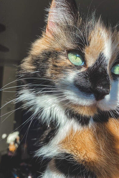she lives in a separate room with her beloved calico cat, a handsome boy named wolfie in the sorority house.